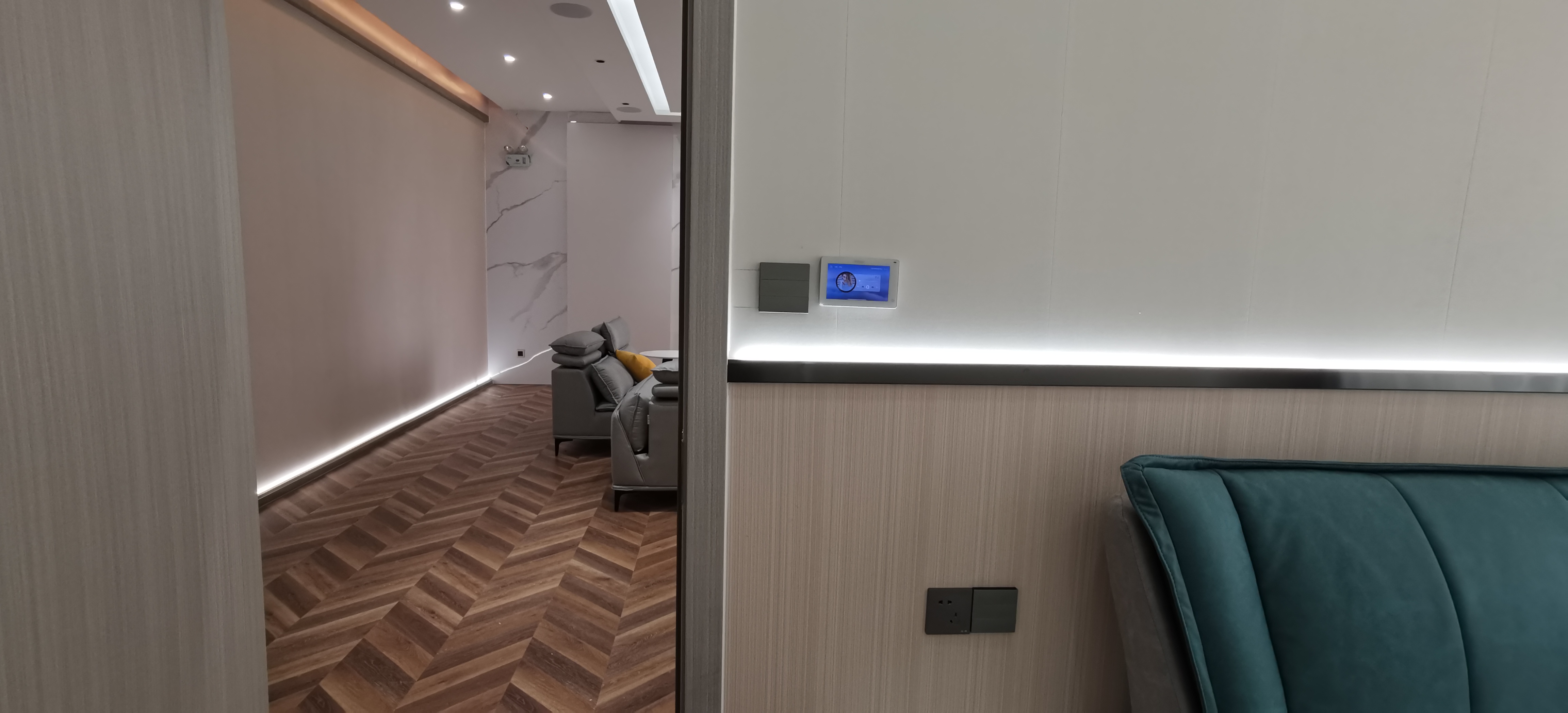 智能家居樣板房包括了客廳、臥室、廚房等功能區,涵蓋智能燈光、智能窗簾、智能背景音樂、K歌娛樂系統、智能開關面板、智能中控屏、智能家電控制系統、安防報警系統等,客戶在參觀時可通過手機app、AI語音、面板、中控屏等多種方式進行控制,更真實地體驗智能居家生活。