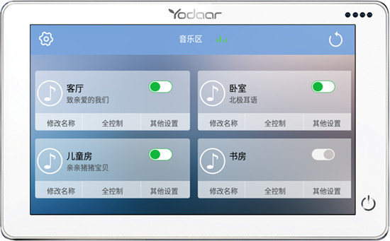 在保證出色的音質之外,悠達還從用戶操作角度出發(fā),對中央機控制面板進行了全新升級,推出背景音樂中控屏。其最大的特色在于,一塊面板可以控制所有房間的音樂,免去所有繁瑣操作。同時,它還可控制智能家居、聯動云門鈴、實現安防監(jiān)控,一屏四用,真正做到了行業(yè)獨家。