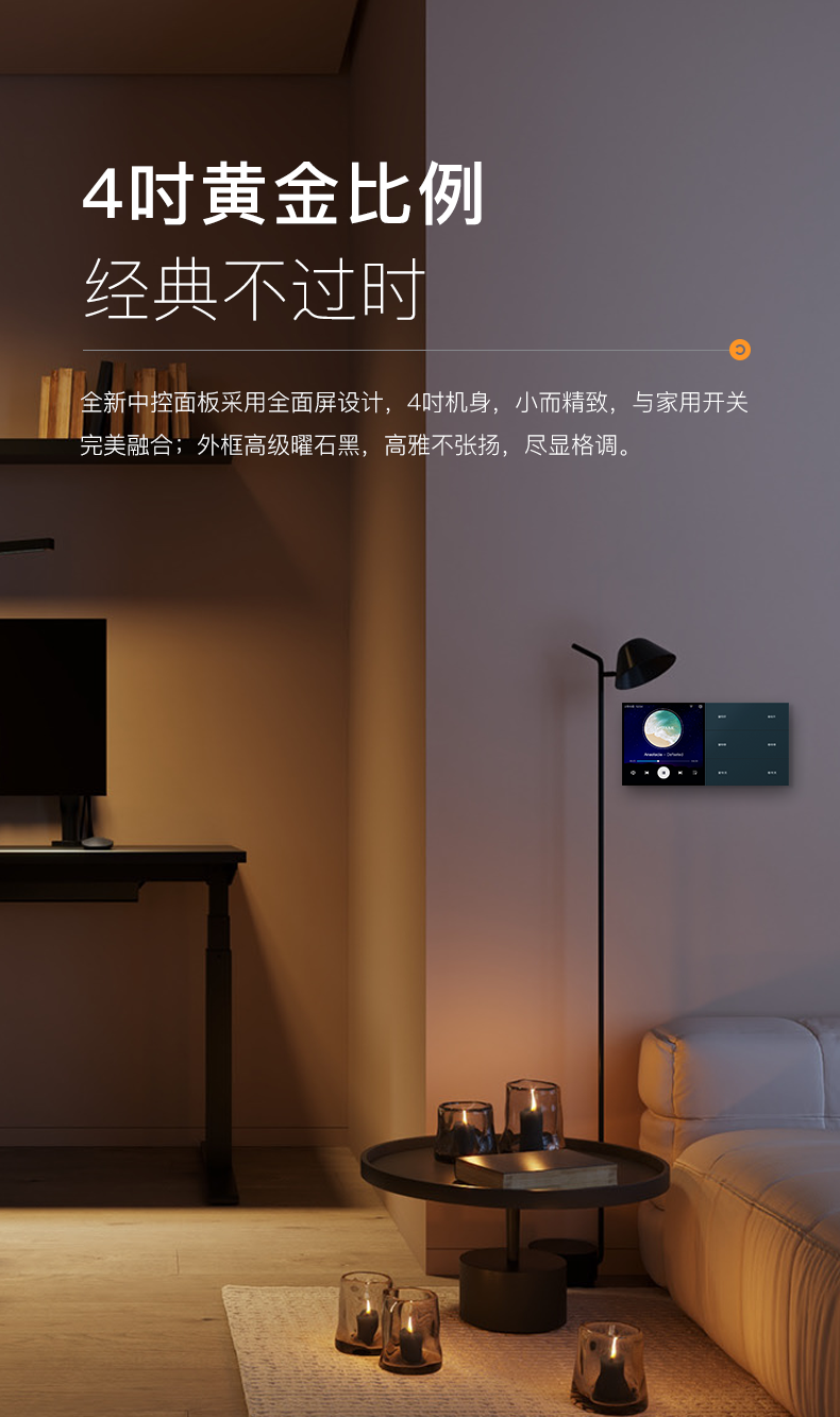 4吋中央機控制面板采用全面屏設計,機身尺寸可與家用開關完美融合,搭配曜石黑的外框,低調而有品味。
